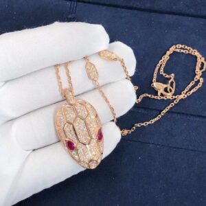 Creating a whirl in the luxury fashion industry, the iconic serpenti designs from the house of Bvlgari can now be paired with your special looks with minimal glam. This Bvlgari Serpenti necklace in 18 kt rose gold, set with rubellite eyes and with pavé diamonds on the chain and the head.