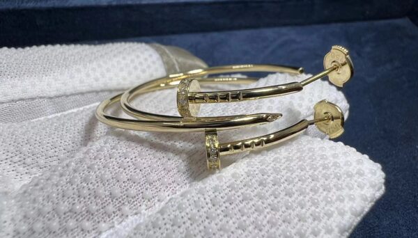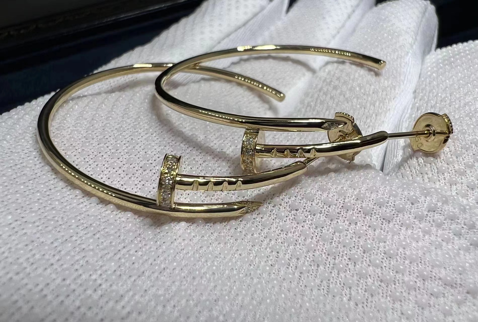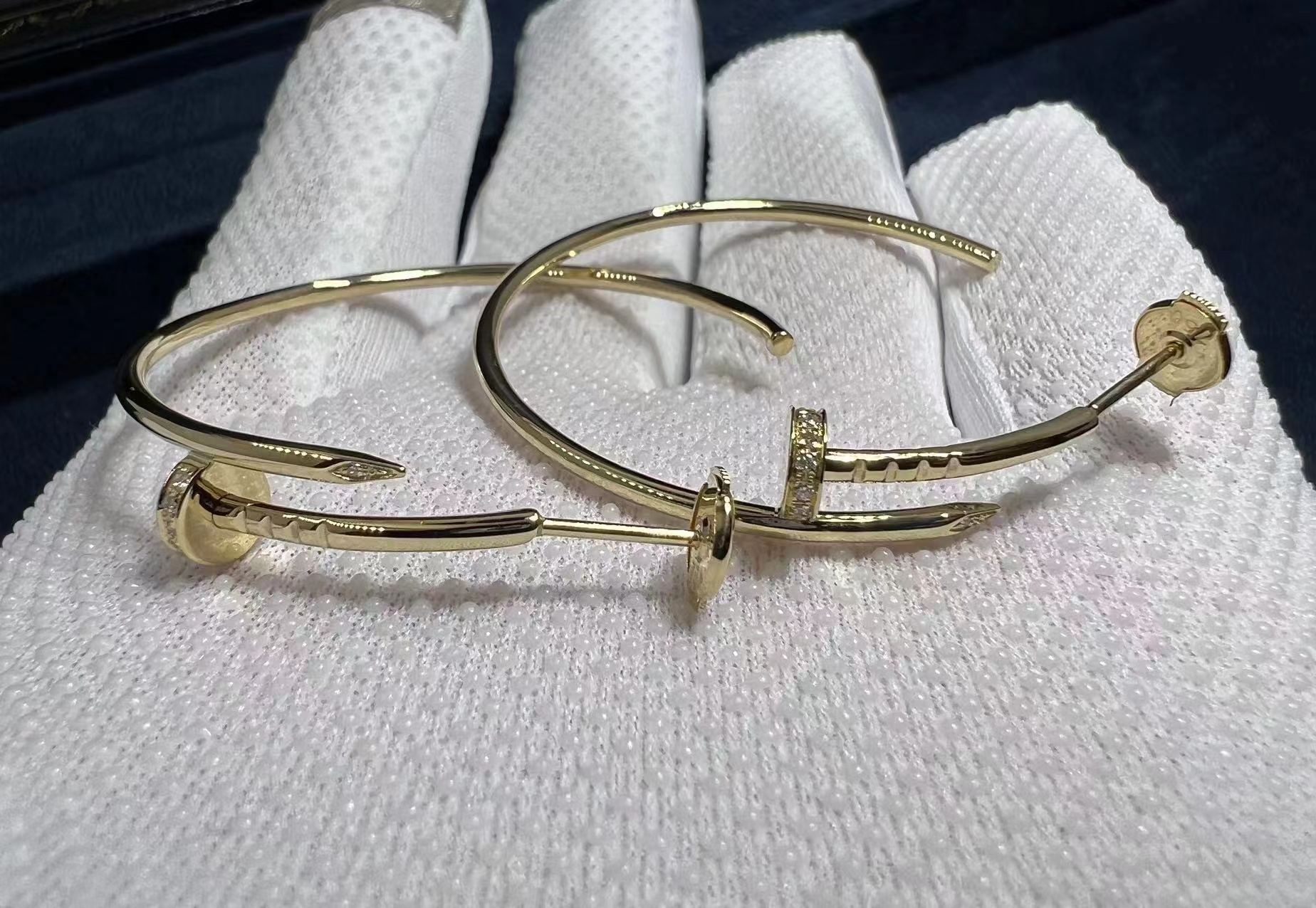 We guarantee all of our custom made jewelry to be 1:1 quality, and that what you see is absolutely what you get. Continuing to serve our customers and gain trust in our name is our mission. What you see pictured of this 1:1 Quality Cartier 18k Yellow Gold Juste un Clou Diamond Hoop Earrings is the actual item you will receive. Every detail possible can be seen in our pictures and we are proud of that, we here have nothing to hide. We want to show you every beautiful angle and edge of our inventory so you fall in love with the piece that’s just right for you.