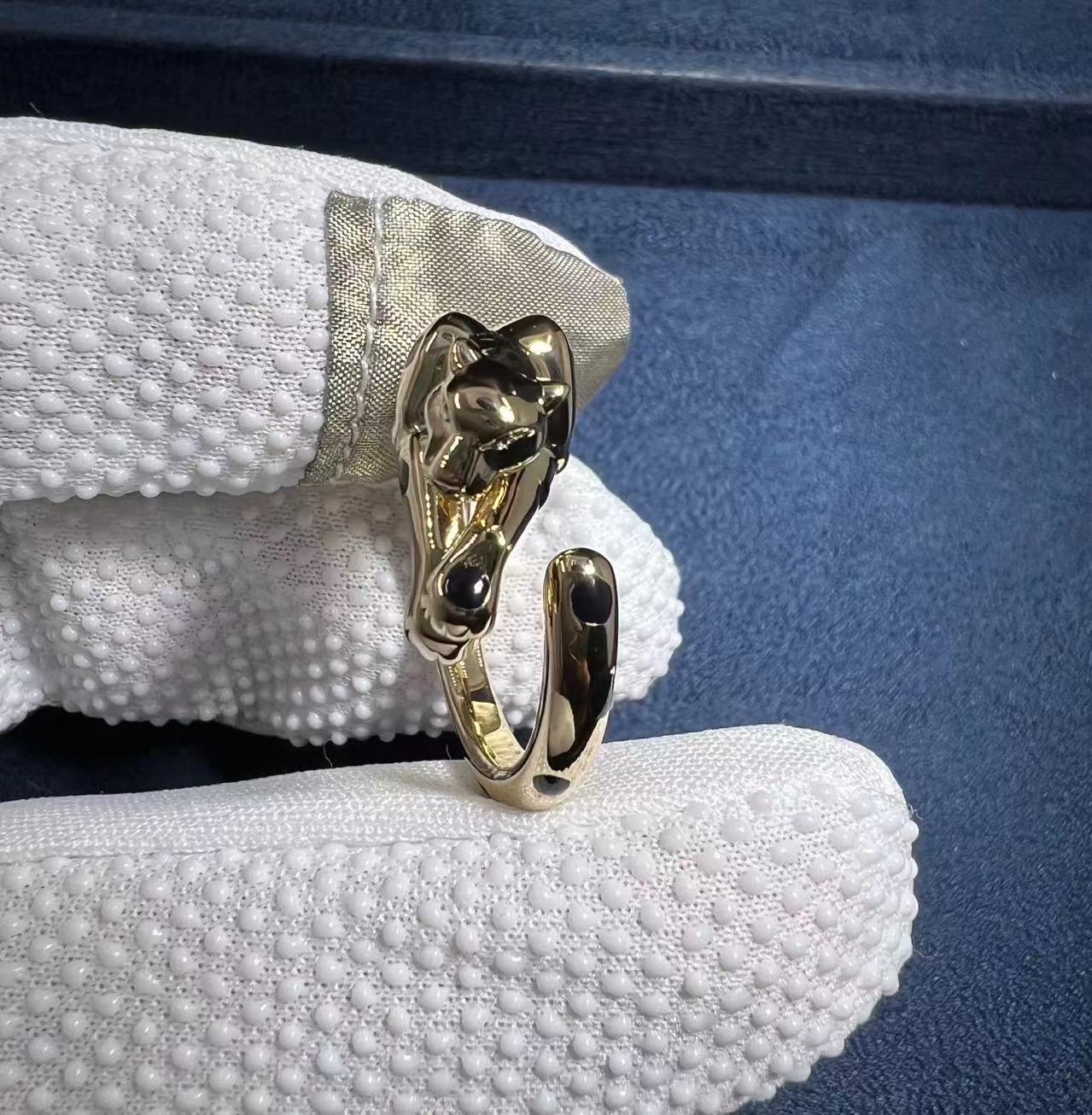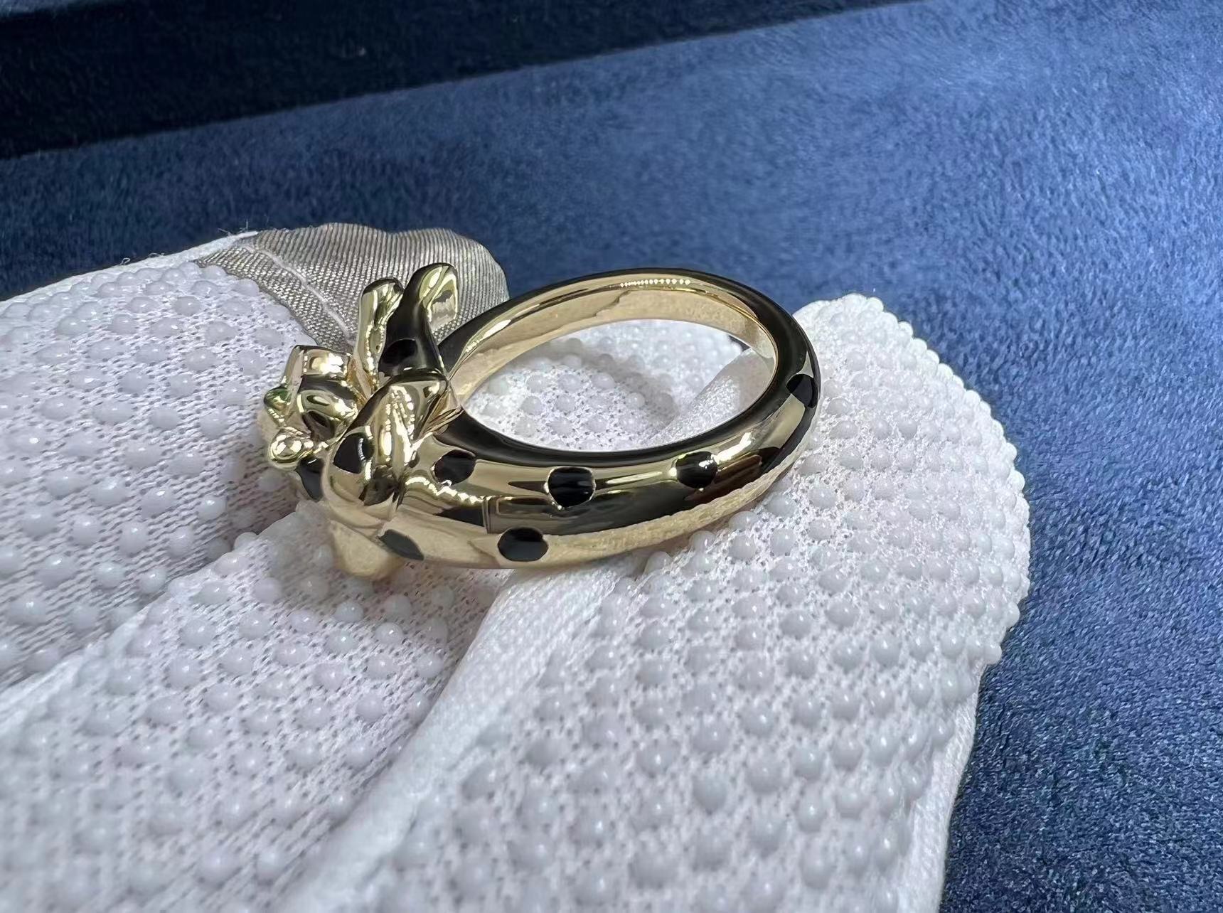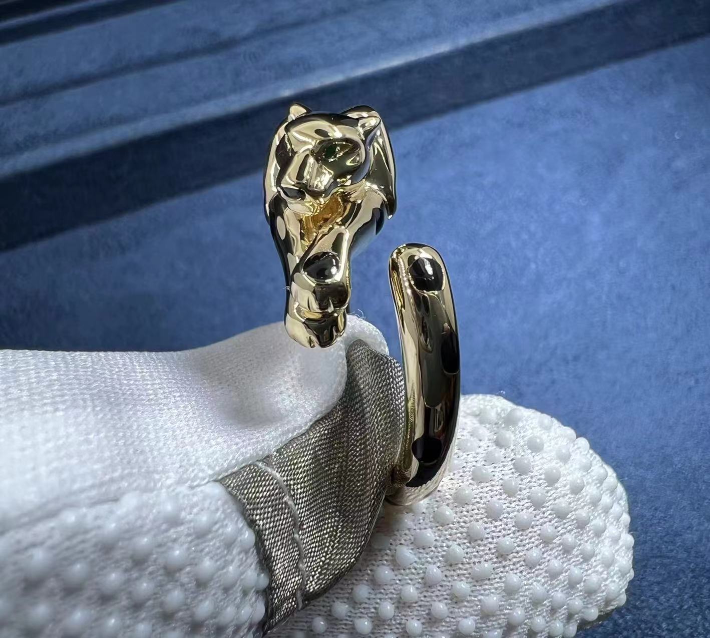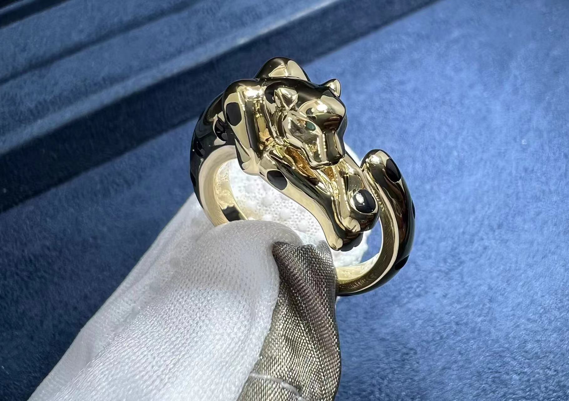 Panthère de Cartier ring, yellow gold 750/1000, onyx, black lacquer, set with 2 tsavorite garnets. Width of the pattern: 8.7 mm (for size 52).