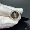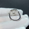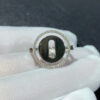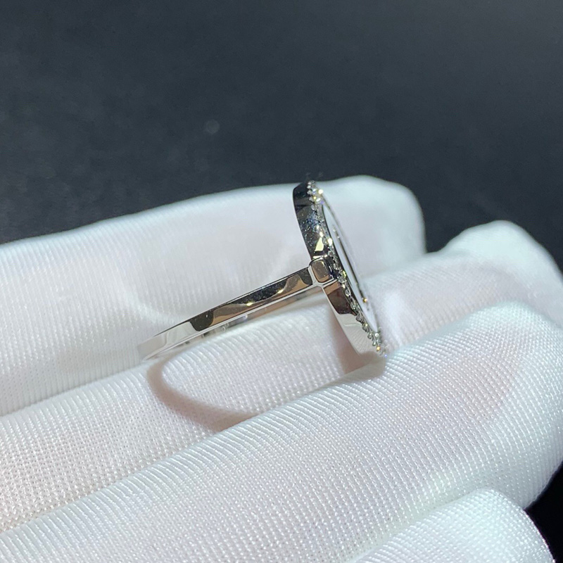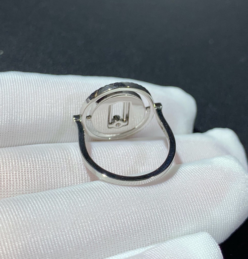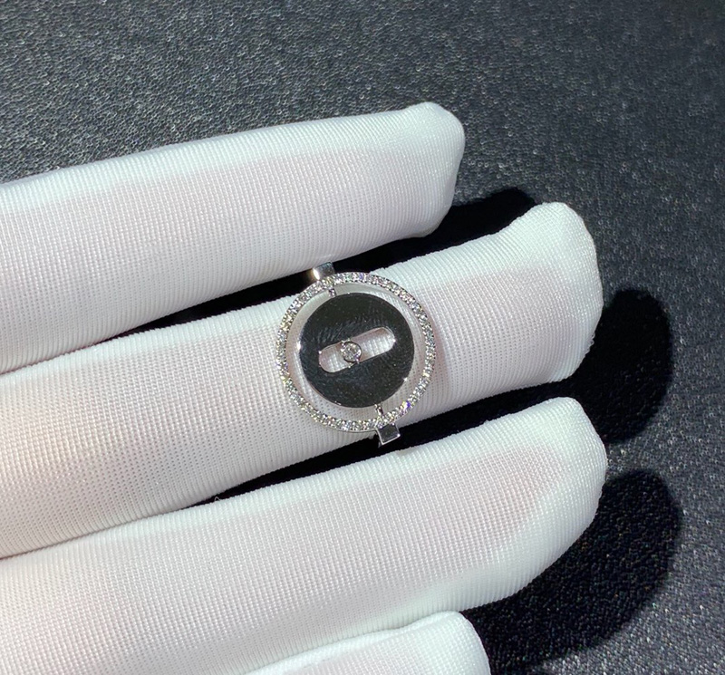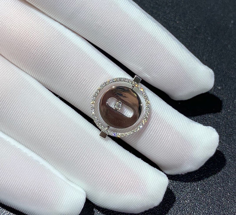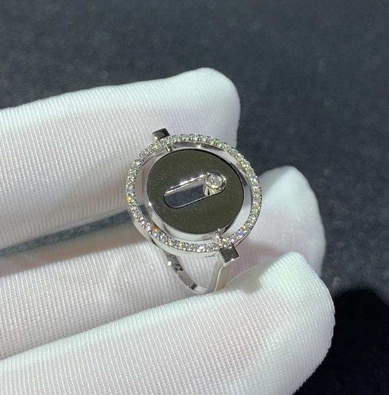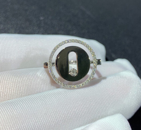 Bringing the power of talismans into fine jewelry making, the Lucky Move collection of Messika is a subtle combination of fun style and elegance. This ring is designed in a simple style from 18k white gold. It has a round-shaped head with a diamond-embedded bezel holding an amulet-like center. The amulet center also has a single moving diamond, a signature of the collection. Complete with hallmark engravings, this will make a statement addition to any evening look.