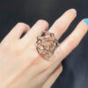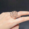 Piaget Rose openwork rose gold ring set with a diamond. Endless source of inspiration, the captivating beauty of the rose is immortalized in a rose gold ring with sensual curves. Cultivated in the Piaget garden with passion and care, the luscious and glamorous rose takes on eternal qualities with radiant openwork petals that invite the light to illuminate her skin beneath like lace. Always full of unexpected surprises, the blooming rose opens up to a sparkling diamond nestled among its generous petals.