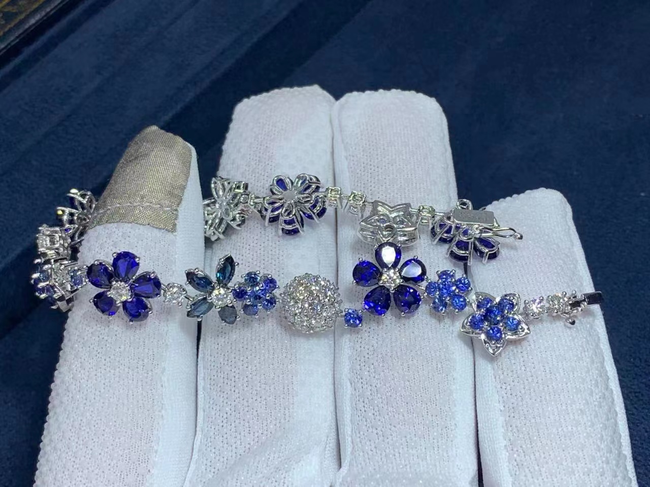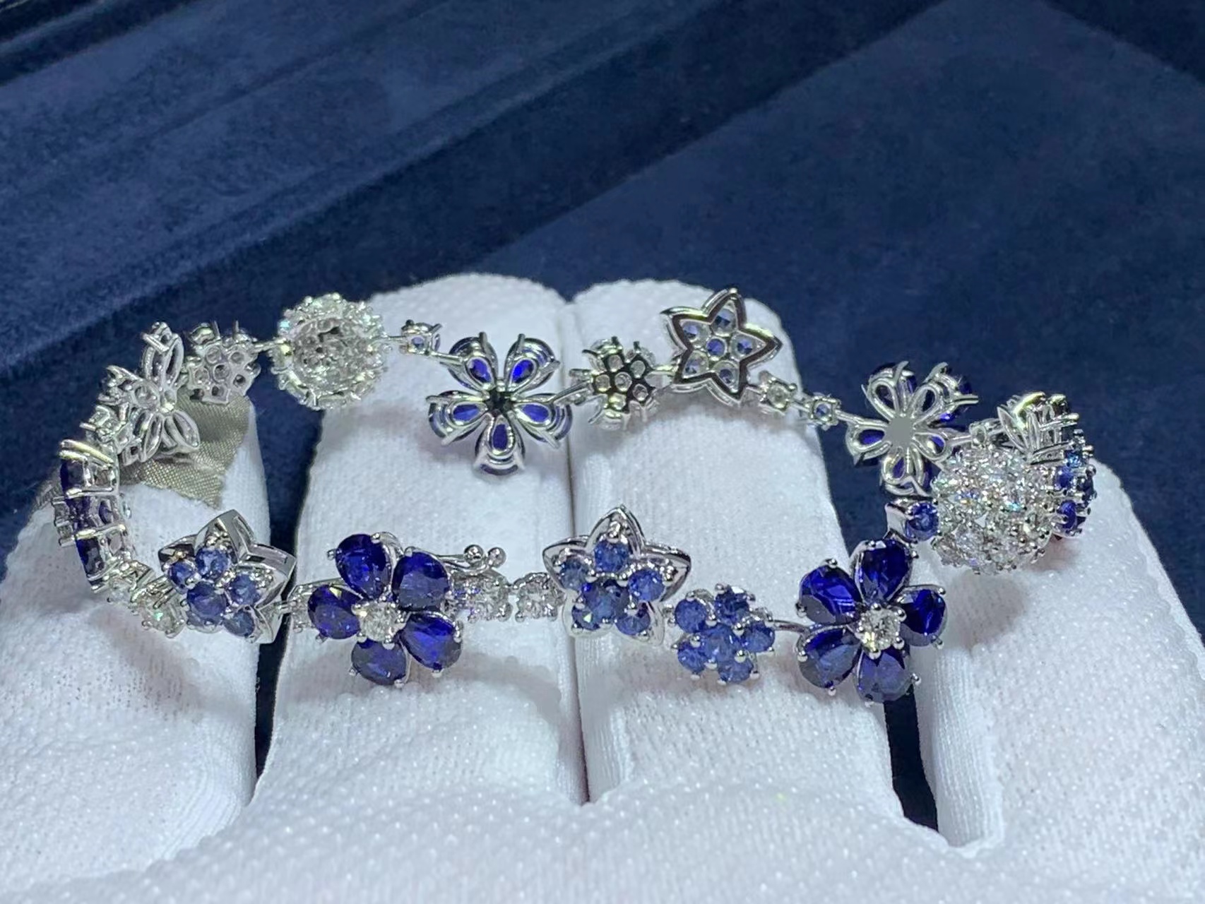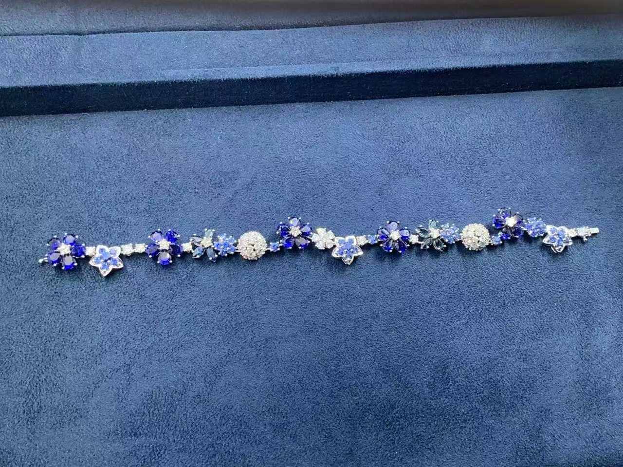 This bracelet evokes a pastoral mood with its exquisitely crafted blue sapphire and diamond flowers.