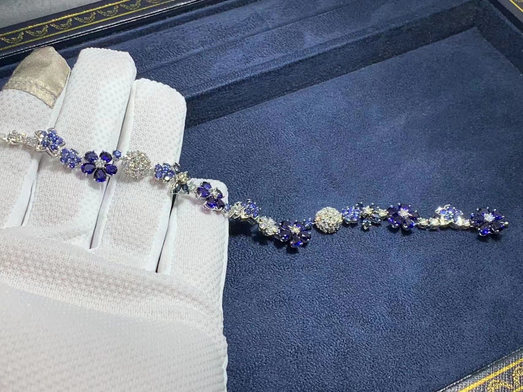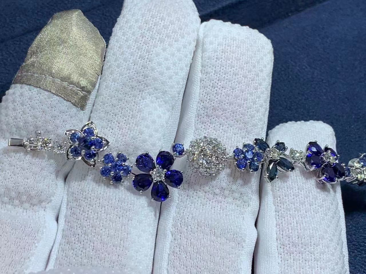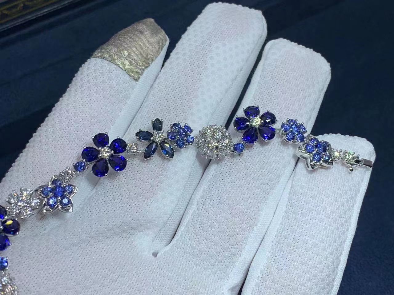 This bracelet evokes a pastoral mood with its exquisitely crafted blue sapphire and diamond flowers.