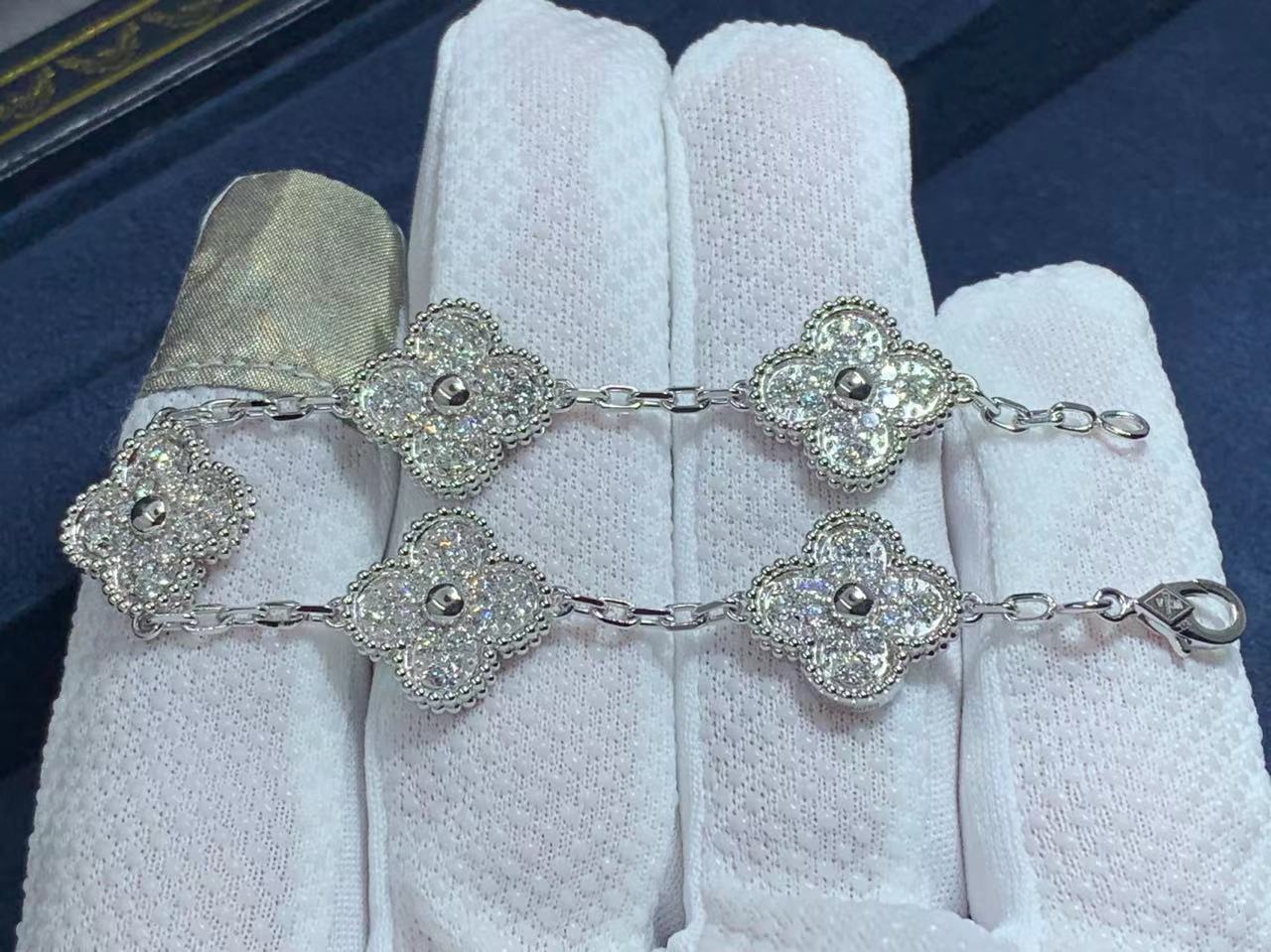 We guarantee all of our custom made jewelry to be 1:1 quality, and that what you see is absolutely what you get. Continuing to serve our customers and gain trust in our name is our mission. What you see pictured of this 1:1 Quality Van Cleef & Arpels 18K White Gold 5 Motifs Vintage Alhambra Diamond Bracelet is the actual item you will receive. Every detail possible can be seen in our pictures and we are proud of that, we here have nothing to hide. We want to show you every beautiful angle and edge of our inventory so you fall in love with the piece that’s just right for you.