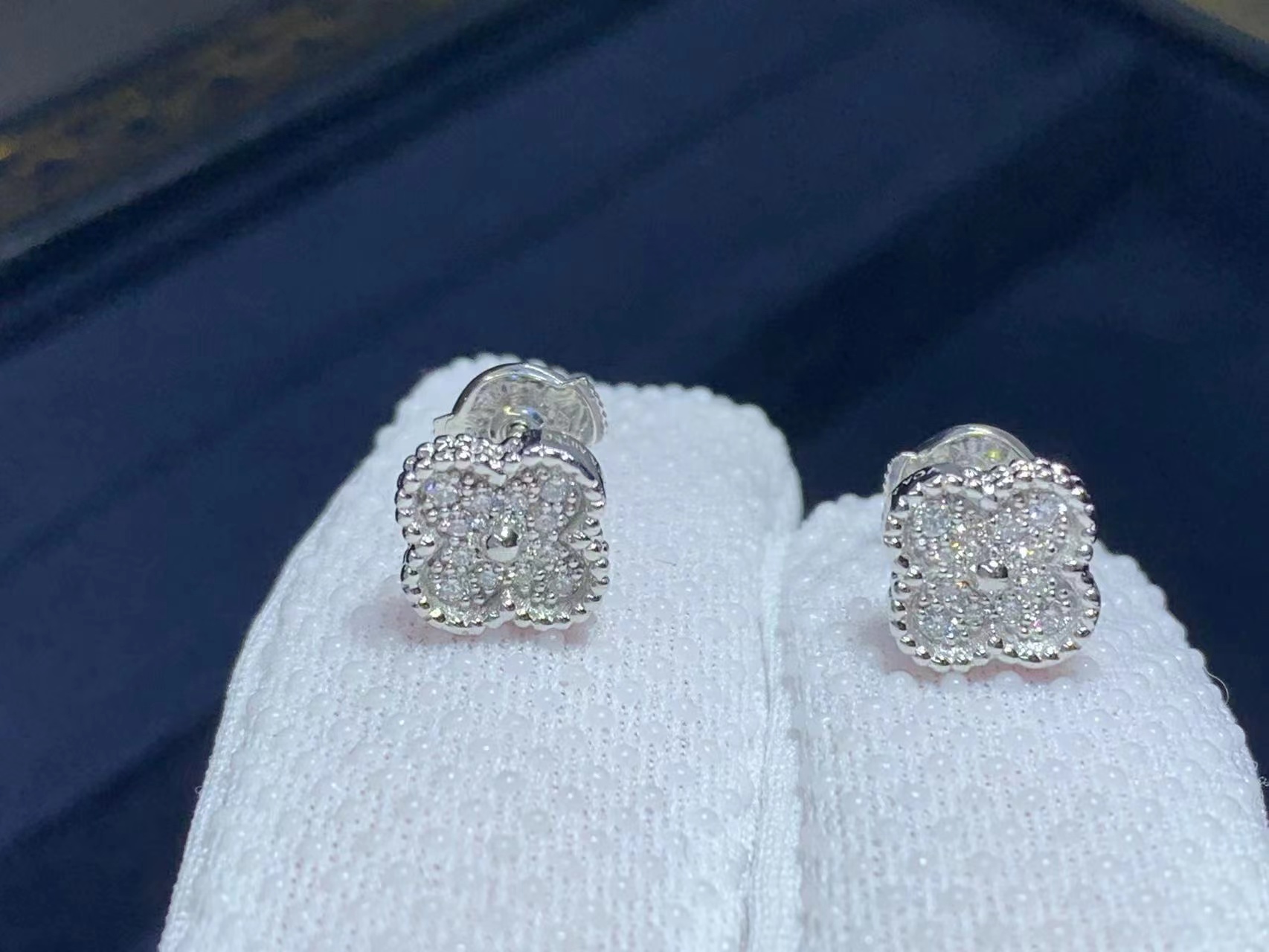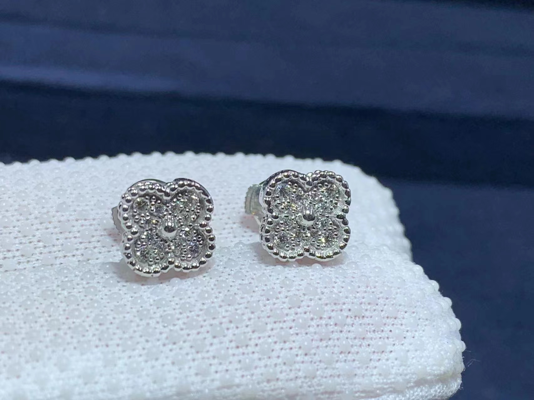 Sweet Alhambra earstuds, white gold, round diamonds; diamond quality DEF, IF to VVS.