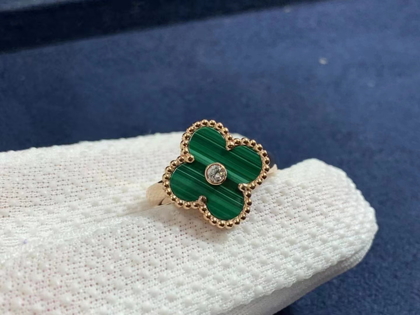 Vintage Alhambra ring, rose gold, malachite, round diamond; diamond quality DEF, IF to VVS.