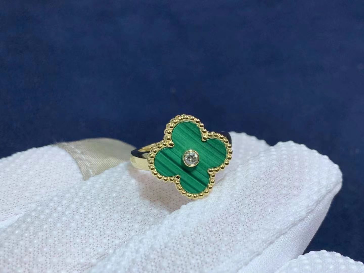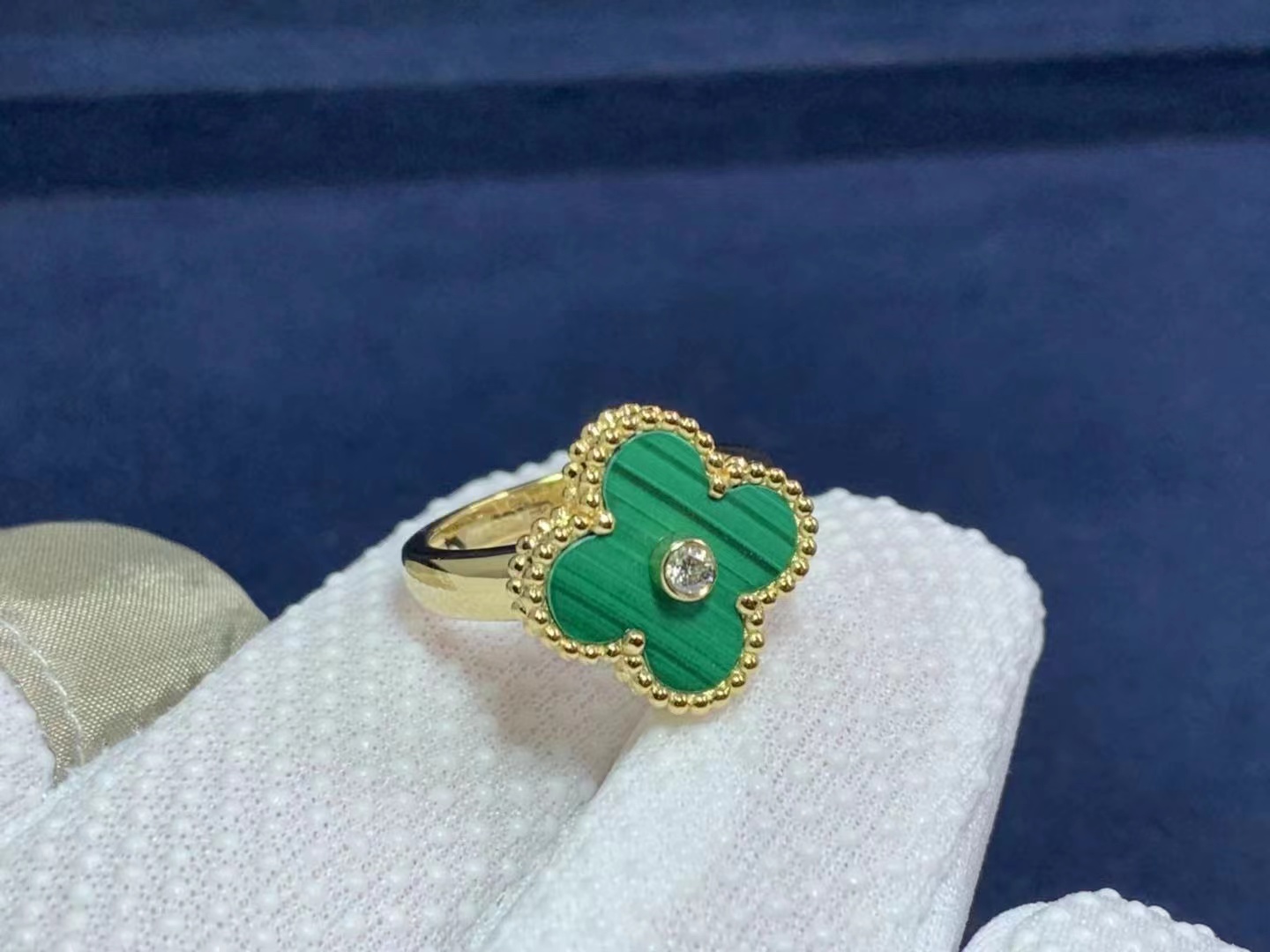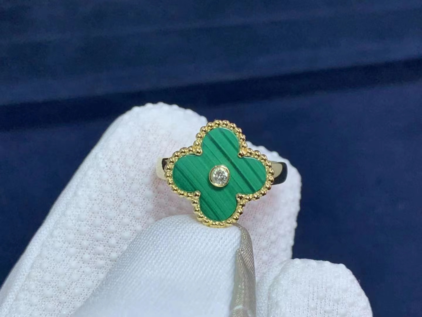 Vintage Alhambra ring, yellow gold, malachite, round diamond; diamond quality DEF, IF to VVS.